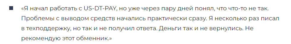 Информации об имеющихся лицензиях и условиях возврата денег сайт не предоставляет. Единственным каналом связи является аккаунт менеджера в Телеграмм Us Dt pay exchange. Отсутствие конкретного ответственного лица осложняет решение возможных проблем при обмене валюты.Отзывы реальных пользователей обменника Us Dt pay