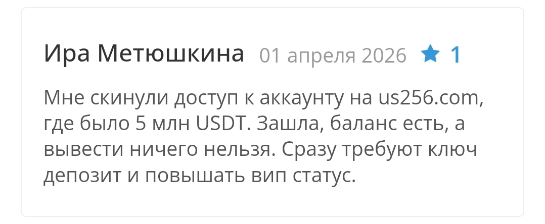 Другой пользователь описывает схему иначе: ему прислали готовый доступ к аккаунту, где якобы уже числилось 5 миллионов USDT, однако вывести что-либо оказалось невозможным, система сразу требовала ключ, депозит и повышение VIP-статуса. Схема от Us256 com в обоих случаях совпадает: деньги вносятся, доступ к ним блокируется, для разблокировки требуют новые вложения.