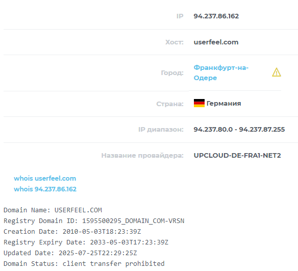 Домен платформы Userfeel Ltd работает с мая 2010 года, что соответствует заявленной дате основания. Обновлялся он в июле 2025 года и будет еще работать 8 лет. Это большой период, показывающий серьезное отношение разработчиков к фирме.