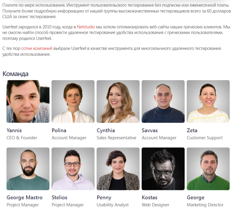 В истории проекта Userfeel Com указывается, что он появился в 2010 году, когда одной организации нужно было удалено протестировать своих потребителей, но подходящие сервисов для этого не нашлось. Сейчас в команде проекта 17 человек.