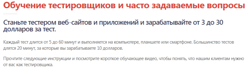 Пользователям, которые будут проходить эти вопросы, предлагают изучить раздел с информацией о том, как на площадке Userfeel Com можно заработать. Каждый тест длится от 5 до 60 минут и выполняется на любом удобном устройстве. Большинство тестов длятся 20 минут, за которые можно получить 10 долларов. Тестерам веб-сайтов и приложений обещают доход от 3 до 30 долларов за тест.