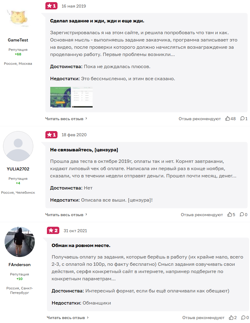 На портале «Отзовик» много негативных отзывов о сервисе. Чаще всего люди жалуются на задержки выплат и трудности с выводом денег. Также многие считают оплату заданий слишком низкой.