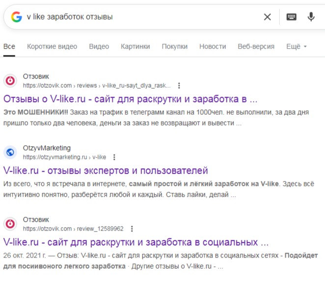 Дальше мы обратились к поисковику, чтобы убедиться в этом факте и прочитать отзывы о проекте V Like Ru. Здесь мы увидели, что данная площадка упоминается не особо много, что явно не характерно для проекта, который работает 13 лет. Причем в первой статье этот источник уже обвиняется в мошенничестве.