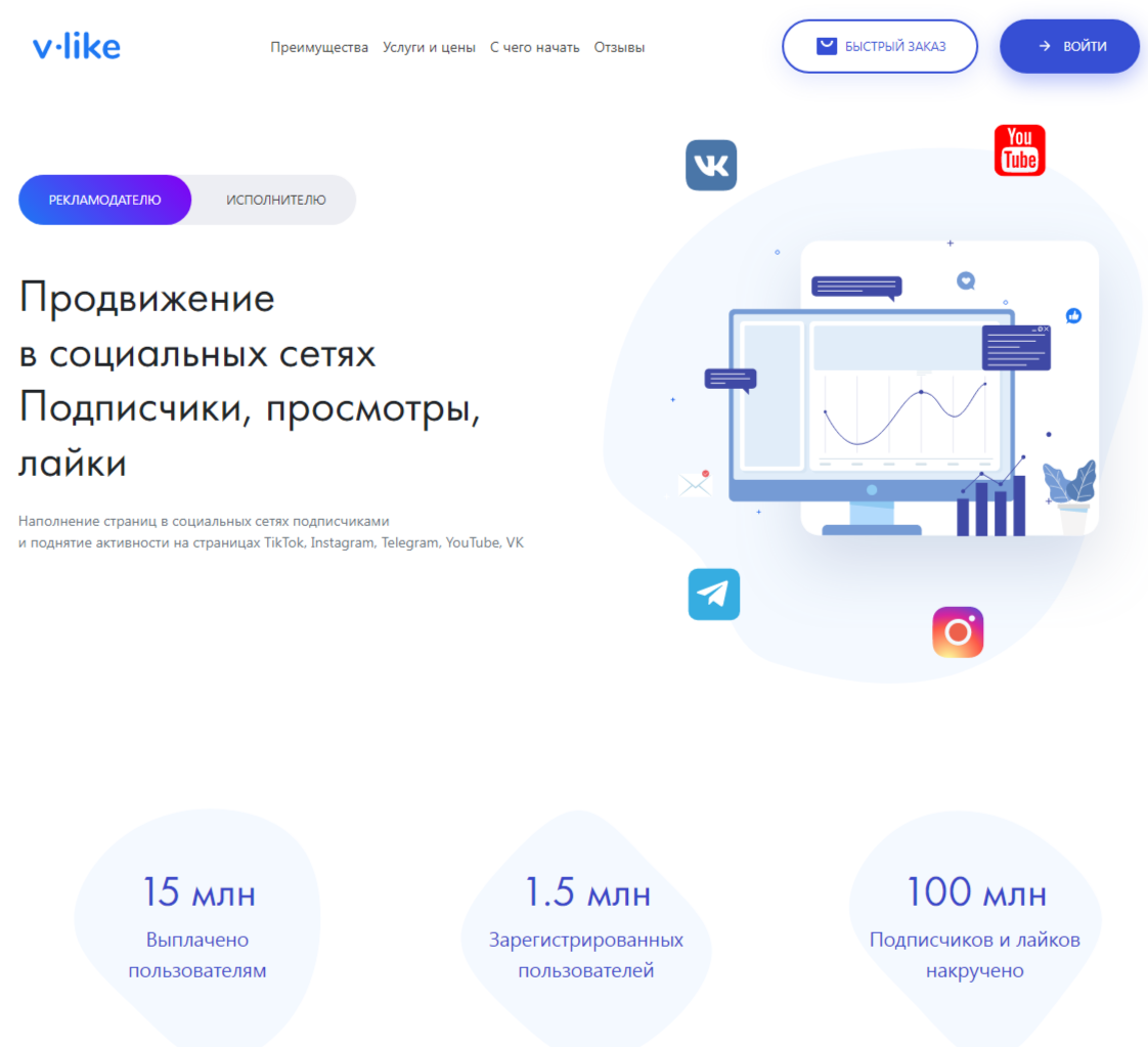 На официальном сайте VLike разработчики сразу коротко и ясно рассказывают о том, что они предлагают. Мы выяснили, что здесь доступны услуги как для рекламодателей, так и для исполнителей. Первым они обещают качественное и эффективное продвижение в социальных сетях, например, поднятие активности и увеличение подписчиков. Вторым они предлагают как раз подписываться на блоги, ставить лайки и так далее за деньги.