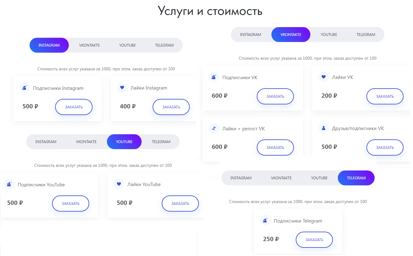 Судя по тому, что услуги и стоимость на сайте VLike написаны только для 4 соцсетей, значи только они и доступны на данный момент для продвижения. Хотя ранее список площадок был больше. Авторы сразу делают пометку, что стоимость указана за 1000 лайков/подписчиков, при этом заказ можно оформить от 100.