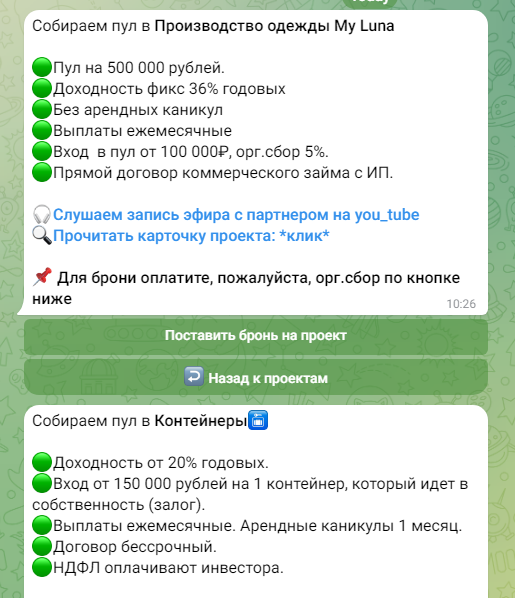 Суть канала Вадима заключается в том, что он собирает соинвесторов, которые готовы платить за поддержку проектов. Выбрав бронь на один из них, перед глазами клиента появится небольшой список с названиями никому неизвестным программ.