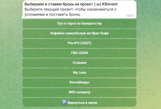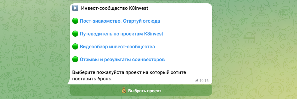 Для того чтобы не запутаться в постах псевдоинвестора, пользователь может использовать бота (k8invest bot), который станет работать после подписки на основной канал. Он и приведет к посту со знакомством, путеводителю, а также в сообщении будет закреплена ссылка на видеобзор сообщества.