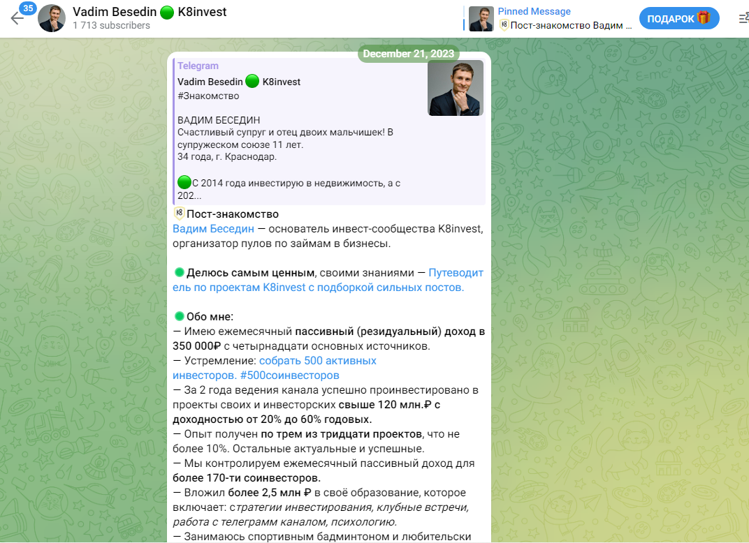 Обзор тг-кананала «Вадим Беседин инвестиции»: отзывы о k8invest и анализ деятельности блогера
