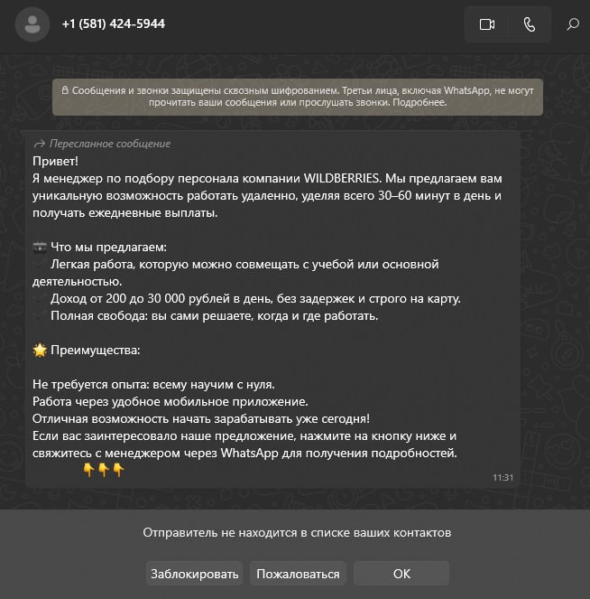 На специализированных форумах, в соцсетях и мессенджерах с группами по поиску работы часто появляются предложения о наборе сотрудников на удаленку. Чаще всего это рассылка в Telegram с обещанием официального сотрудничества с Wildberries.