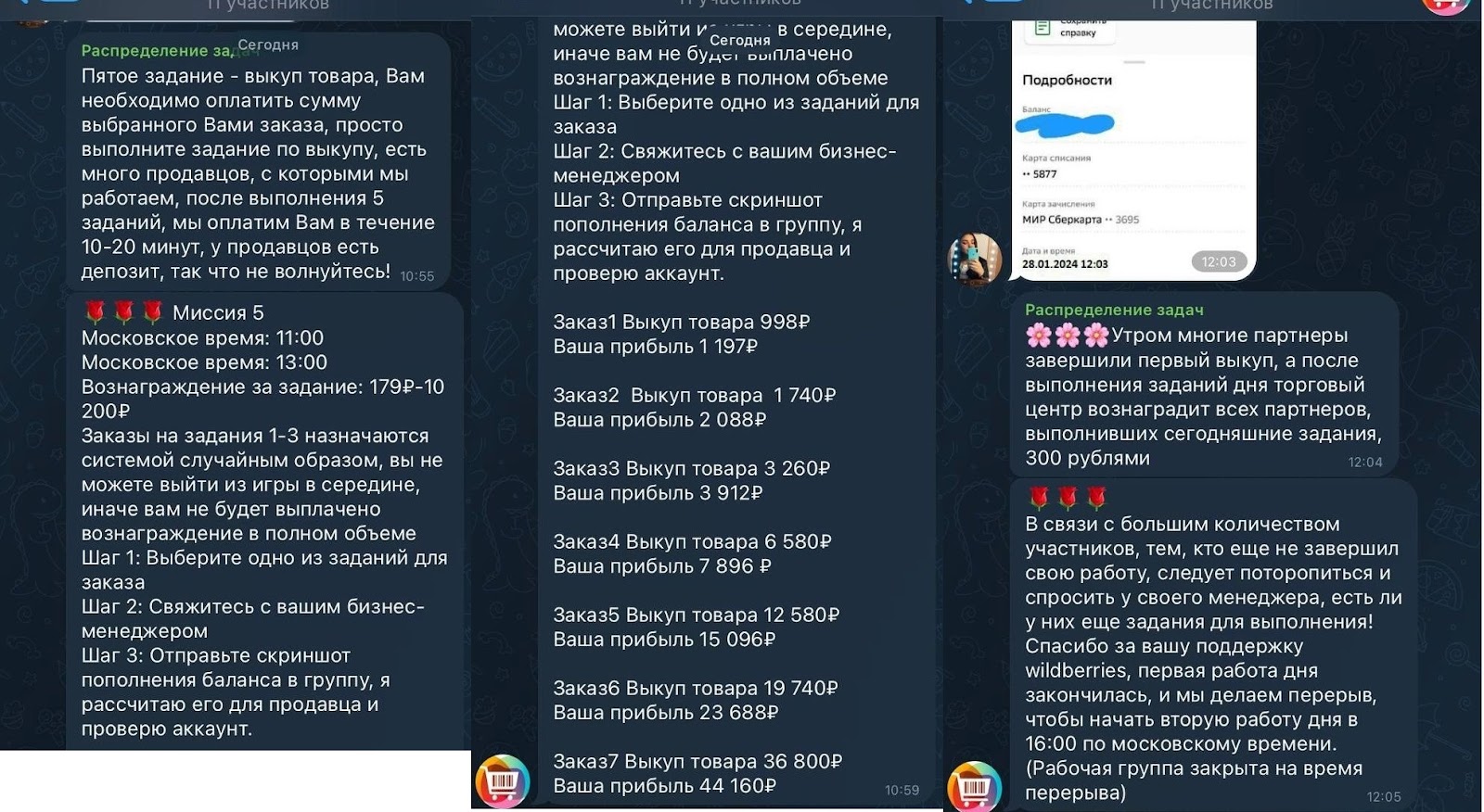 После регистрации в “личном кабинете” появляются задания — выкупить товар за свои деньги. Кроме того, куратор в Телеграм ведет свою группу, где рассылает уведомления.