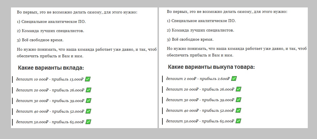 Но даже если пользователь выкупил всю группу товаров, владельцы не спешат оплачивать оговоренные суммы. В условиях указано, что надо сначала оплатить страховку, налоги или другие фиктивные платежи. Все эти взносы идут прямо мошенникам и никогда не возвращаются.