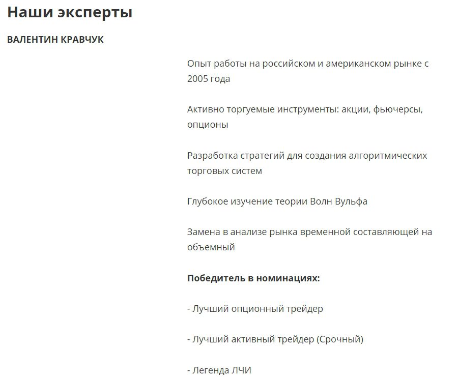 Валентин Кравчук – трейдер с шестнадцатилетним опытом торговли на российском и американском рынке. Ранее активно торговал акциями, фьючерсами, бинарными опционными. На данный момент занимается разработкой стратегий и создает алгоритмические торговые системы. Также он поставил перед собой задачу глубоко изучать теорию Волн Вульфа и своими знаниями делится в вебинарах, семинарах и обучающих курсах. Стоит ли доверять данному трейдеру, узнаем в этом обзоре.