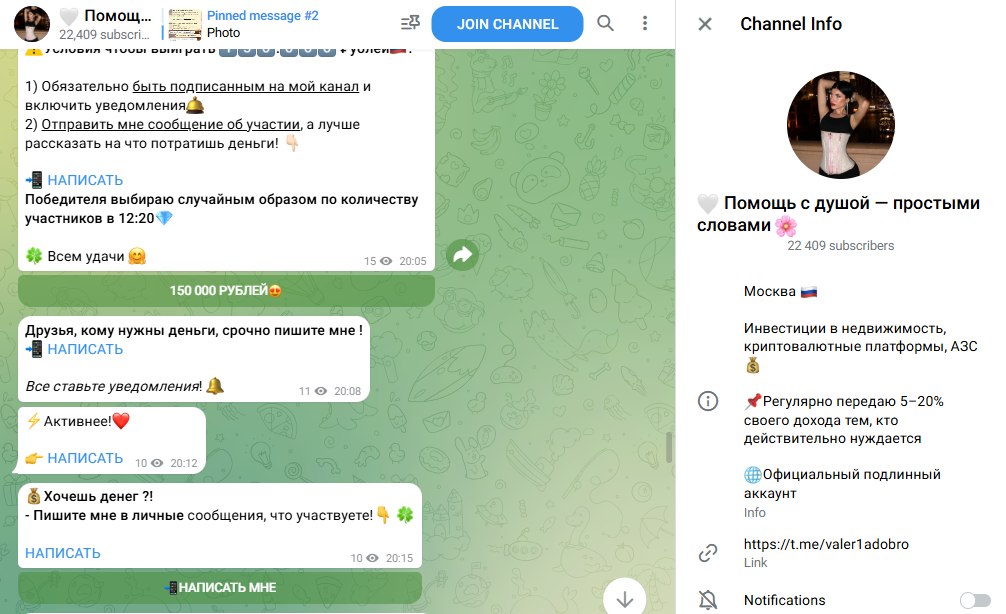 Отзывы о ТГ проекте Valer1a dobr0 отрицательные. Комьюнити презентуется как благотворительная площадка, в ленте Валерия регулярно анонсирует розыгрыши крупных денежных сумм от 100 тысяч рублей. Более детально о схеме проекта расскажем в нашей статье.
