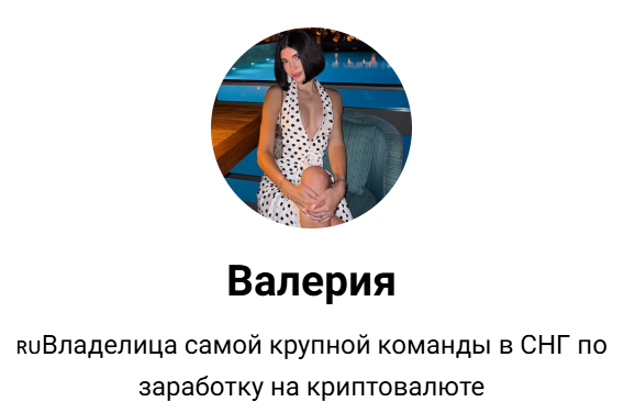 Валерия представляется владелицей самой крупной команды в СНГ по заработку на криптовалюте. Ссылок на профильные ресурсы и демонстрации реальной истории сделок нет. Аналогичное описание проекта Valeria dobro встречается на множестве шарашек.