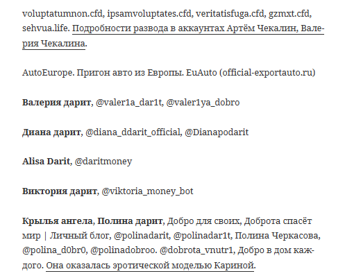 Для сообщества Валерия добро была создана фальшивая личность ведущей, которая от невероятной щедрости не знает, куда девать свои миллионы и постоянно устраивает денежные рулетки. Комментарии в ленте оставлять нельзя, так как пользователи сразу поймут, в чем заключается схема обмана. Кто стоит за проектом достоверно неизвестно. Следующий канал может иметь уже другое название и сменить приевшееся аудитории лицо дарительницы.