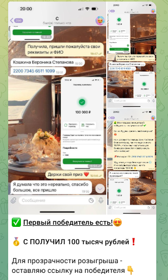 - чтобы принять участие в розыгрыше, подписчик должен вступить в аналогичные каналы и прислать личное сообщение администратору;