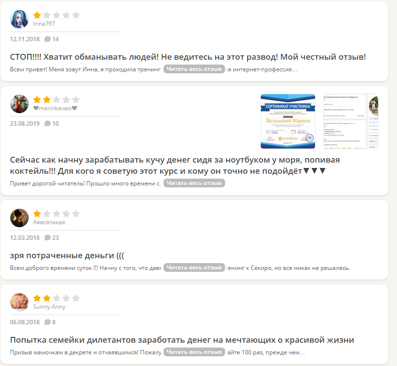 Внимательно изучив деятельность четы Секиро, сложилось впечатление, что люди захотели заработать на всем и сразу. По итогам нашего обзора-разоблачения Валерия и Ксении Секиро мы пришли к выводу, что связываться с этой парой точно не стоит. При этом неважно, какое именно направление решит выбрать человек. На, то, что проект представляет собой один большой скам указывают следующие признаки:
