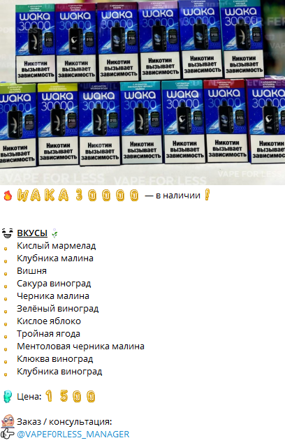 В следующей записи Vape For Less демонстрируют партию жидкостей с разными вкусами. Чтобы сделать заказ, клиент должен написать менеджеру в личные сообщения Телеграм @ Vapef0rless Manager. Мы ничего не знаем про этого человека, он легко может оказаться мошенником.
