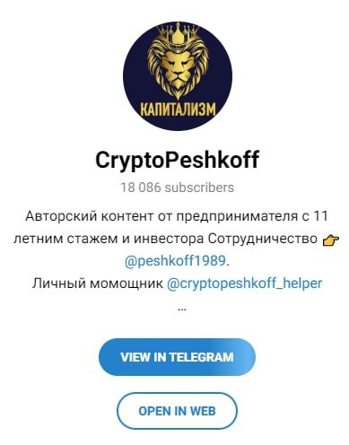 Василий Пешков Крипто Скамер – Телеграм-канал трейдера, который специализируется на работе с криптовалютой. В ленте инвесторам предлагается авторский контент от финансиста с 11-летним стажем работы. Предприниматель проекта работает только с кошельком Метамаск. Также спекулянт предлагает своим подписчикам уникальную площадку знаний «Криптобаза». Это специальные, разработанные по методике автора, занятия, посмотрев которые человек научиться основам инвестирования.