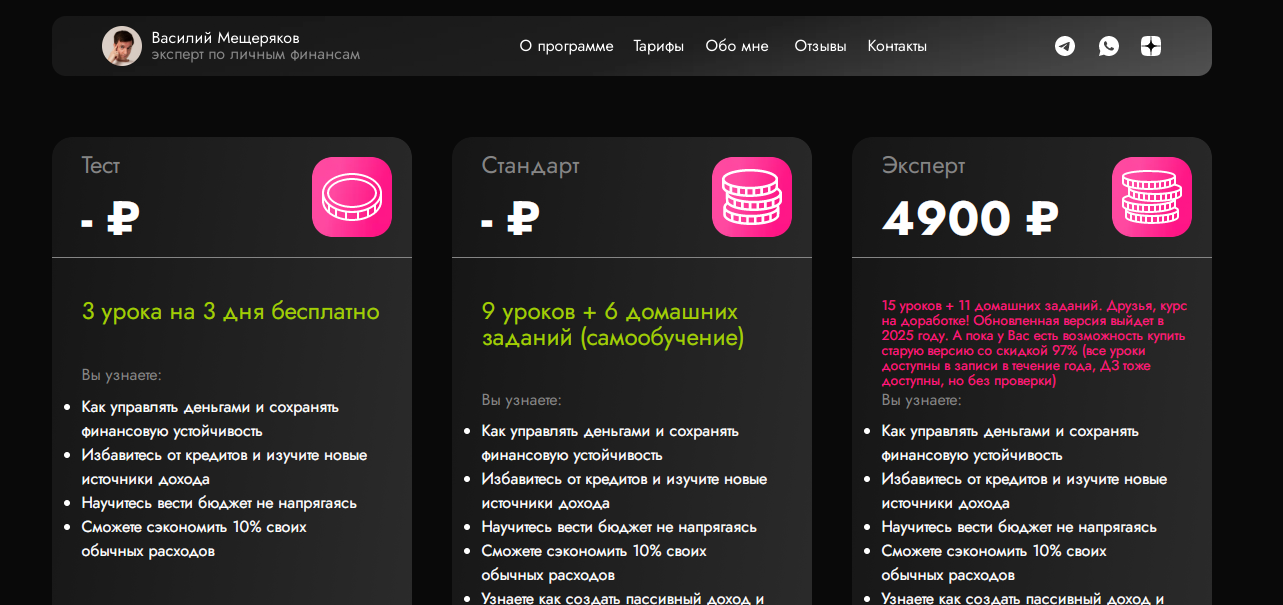 Канал в ТГ «Вася и финансы» создал Василий Мещеряков. Он называет себя экспертом с 15-летним опытом, который прошел длинный путь от рядового менеджера до директора по продажам. Он научился управлять финансами, осознал типичные ошибки многих людей и разработал собственные курсы, которые сейчас продает.