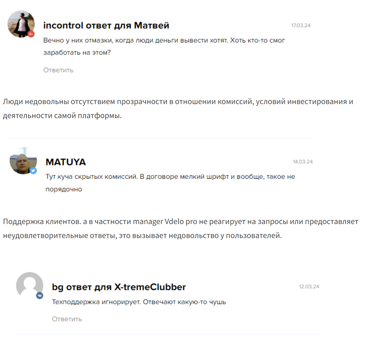 Нельзя отметать и негативные отзывы о платформе. В частности, пользователи жалуются на отсутствие прозрачности в плане комиссий и условий вложений, недостаточное количество сведений касательно работы площадки. Иногда менеджеры Вдело вообще не реагируют на запросы.