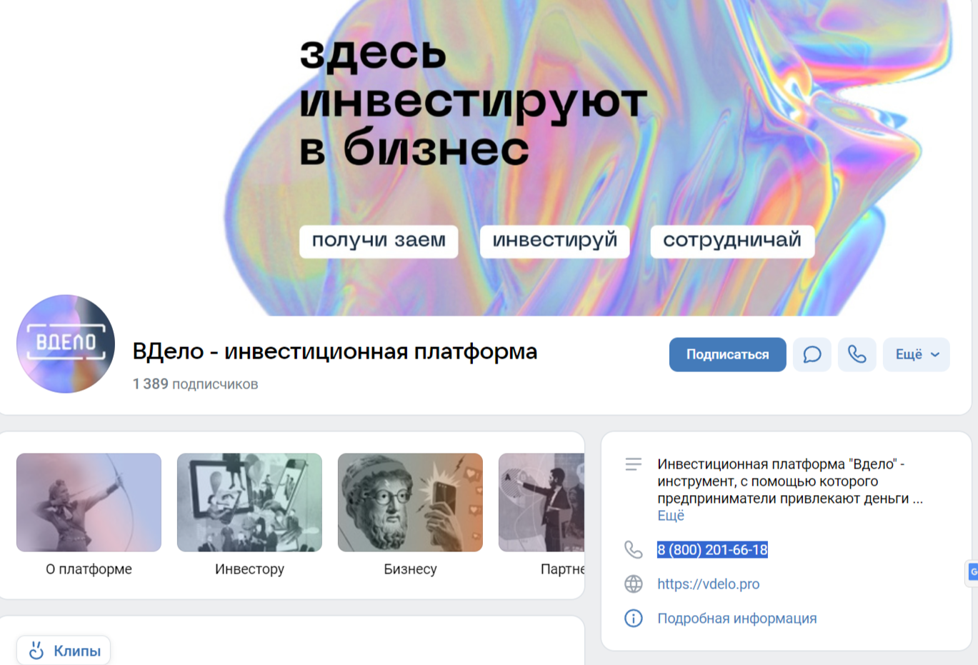 • Вдело — инвестиционная платформа. Страница доступна в ВКонтакте по ссылке vdelo invest. Здесь клиентов привлекают доходностью для инвесторов в размере от 17 до 30%, гибкими сроками, вложением от 1000 р и обеспечением займов. Представителям бизнеса обещают выплаты от 50 тыс. до 100 млн рублей, ставку от 17 до 30%, гибкий график и другие опции.