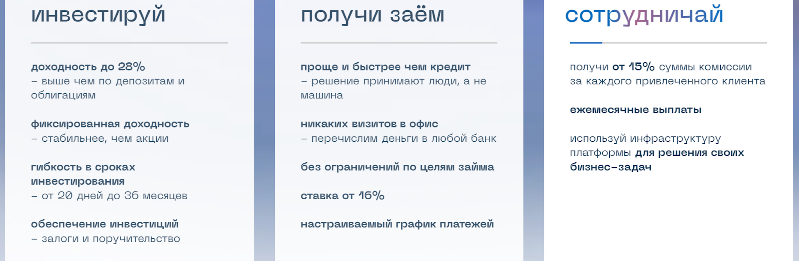 Параллельно инвестиционная платформа Вдело предлагает помощь в получении денег обычным заемщикам. На сайте указываются следующие условия сотрудничества: