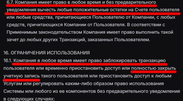 Vedex может самостоятельно списывать средства с аккаунта клиента без предупреждения. А в разделе 16 сказано, что биржа вправе заблокировать транзакцию или полностью закрыть ваш аккаунт в любой момент.