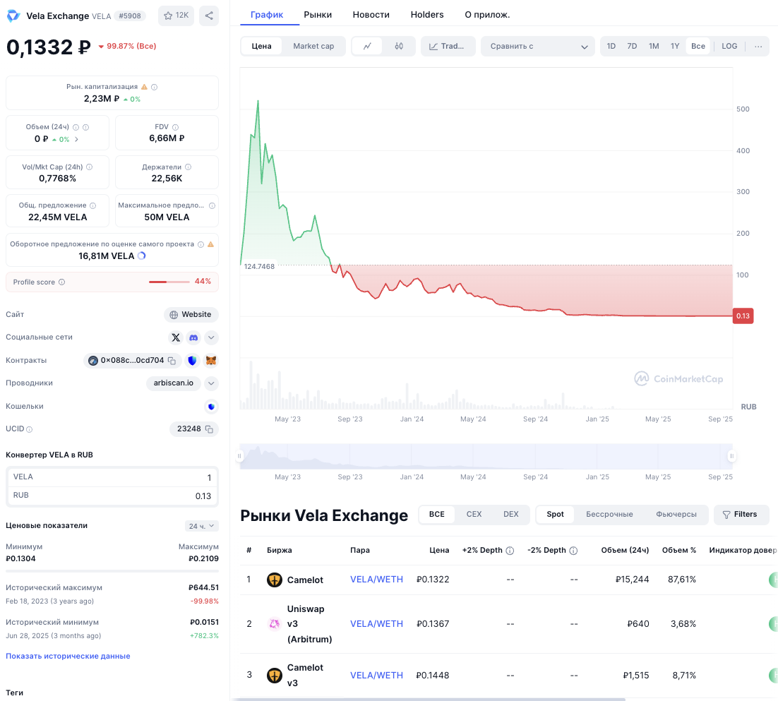 На 24 сентября 2025-го года биржа Vela Exchange больше недоступна. Владельцы платформы удалили весь контент на своих каналах и страницах VelaExchange в соцсетях.