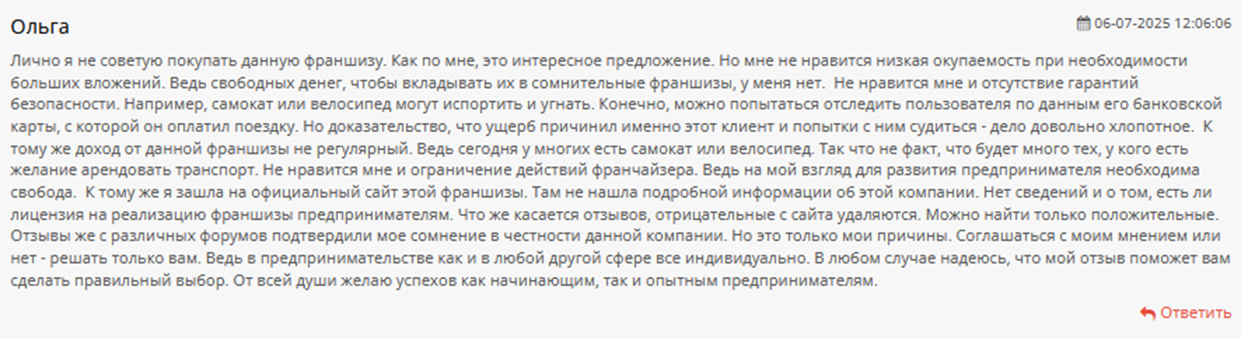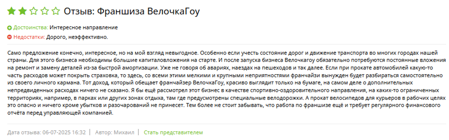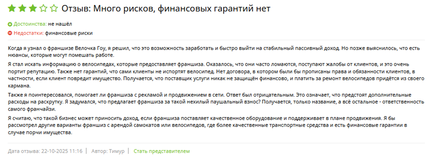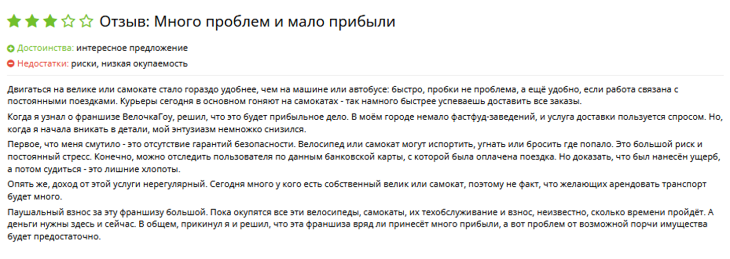 Среди негативных отзывов о сотрудничестве с Велочка Го – большие капиталовложения, которые нужны при запуске. Речь идет не только о рекламе, но и о страховке, техобслуживании, замене комплектующих. Франчайзер очень красиво все расписывает на бумаге, но реальность оказывается диаметрально противоположной.