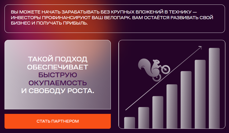 Компания Велочка Гоу предлагает открытие бизнеса без лишних расходов. Потенциальным партнерам предлагается открыть собственный бизнес с минимальными расходами. Среди приоритетных направлений – прокат электровелосипедов для служб доставки.