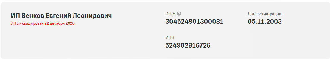 Венков начал карьеру в далеком 2003 году. Зарегистрировался как ИП в сфере электромонтажных работ в Нижегородской области. Работал много лет. Потом внезапно закрылся по неизвестным причинам.