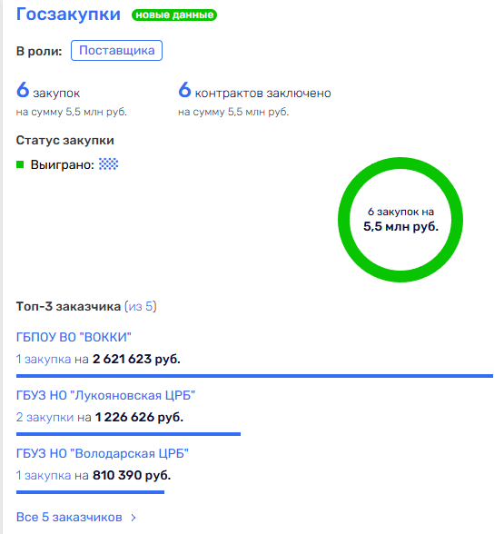 Но вот удивительная странность. Компания с копеечным уставным капиталом моментально получает крупнейшие государственные контракты на умопомрачительные 5,5 миллионов рублей. ГБПОУ ВО «ВОККИ» доверил новичку 2,6 миллиона рублей. ГБУЗ НО «Лукояновская ЦРБ» отдала 1,2 миллиона. ГБУЗ НО «Володарская ЦРБ» – 810 тысяч.