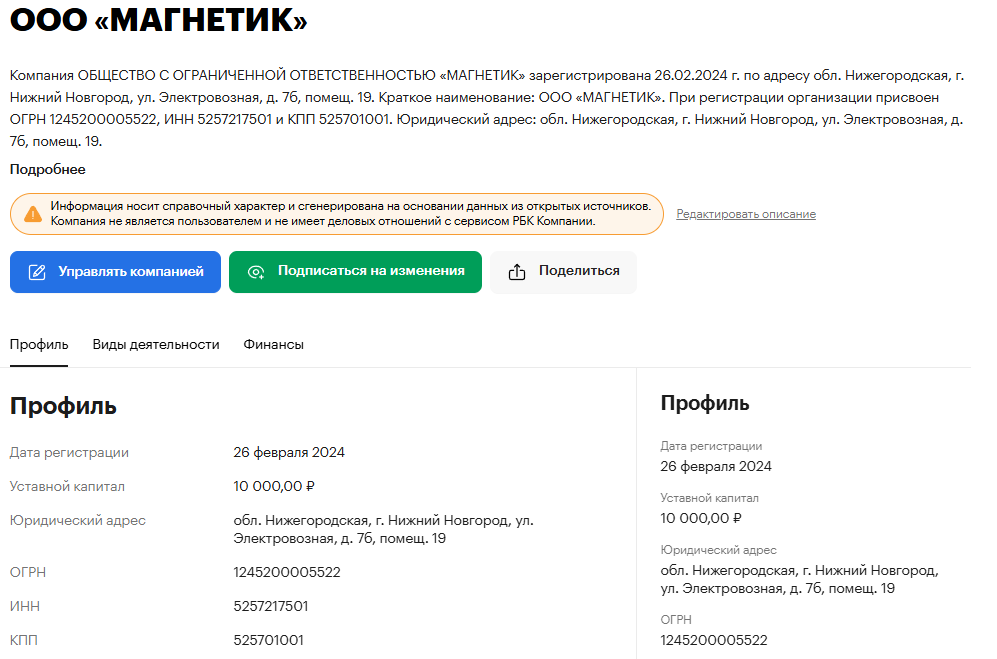 В феврале 2024 года Венков Евгений Леонидович внезапно создает новую компанию – ООО «МАГНЕТИК». Вернулся к электромонтажным работам. За неполный 2024 год выручка составила скромные 374 тысячи рублей.
