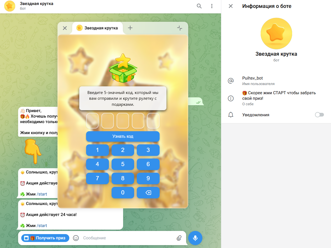 После запуска подобного бота через команду /start, вам предлагают вступить в новый проект, где “точно можно получить награду”, но так ли это на самом деле? Называется он, Звездная Крутка, логин регулярно меняется, в нашем случае это Puihsv bot. У бота есть свое WEB3 приложение внутри телеграмма, а задача нового участника легкая: запустить и ввести код, который якобы вам пришлет команда по номеру телефона.
