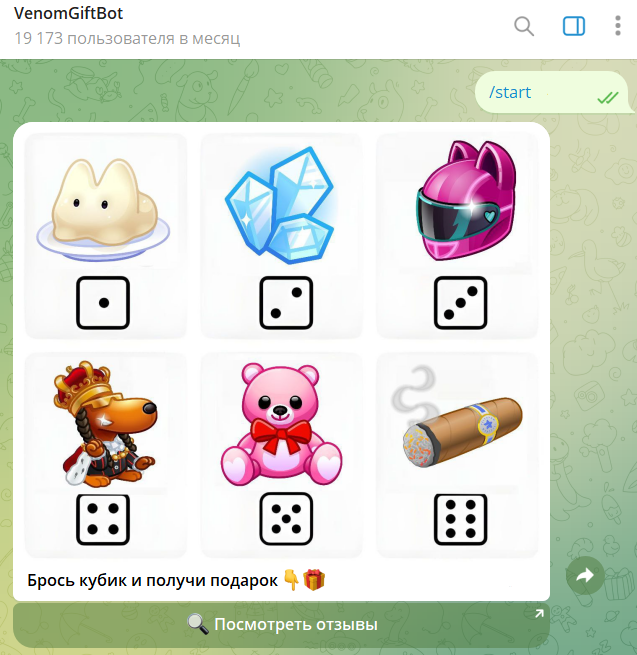 На первый взгляд, суть заработка Venom Gift Bot кажется максимально простой. У команды якобы существовал некий банк с NFT коллекциями, а в чат отправлялась таблица, где каждому токену присуждалась сторона игрального кубика: от 1 до 6. Затем, через встроенный функционал с бросанием костей, игроку предлагали испытать удачу. И, кажется, вот она победа, но просто так вывести приз не удается.
