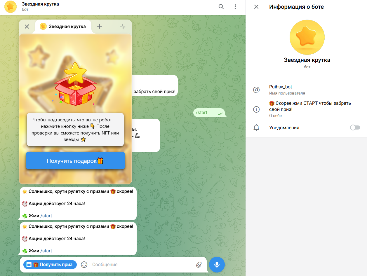 По итогам анализа Веном Гифт Бот, где под видом раздачи пользователям обещали бесплатные звезды / NFT подарки, можно выделить следующие минусы: