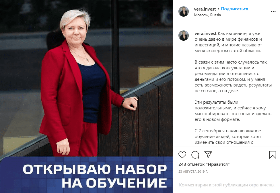 Вера Семенова – трейдер, автор образовательных материалов, создатель Московского клуба инвесторов МКИ. Спекулянтка заявляет о 20-летнем стаже и опыте работы в СВ-Капитал. Мы оценили страницы в Инстаграме, на которых трейдер ведет свою деятельность, и подготовили свое мнение о том, стоит ли ей доверять.