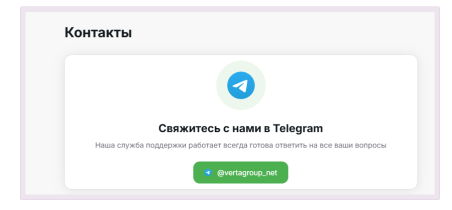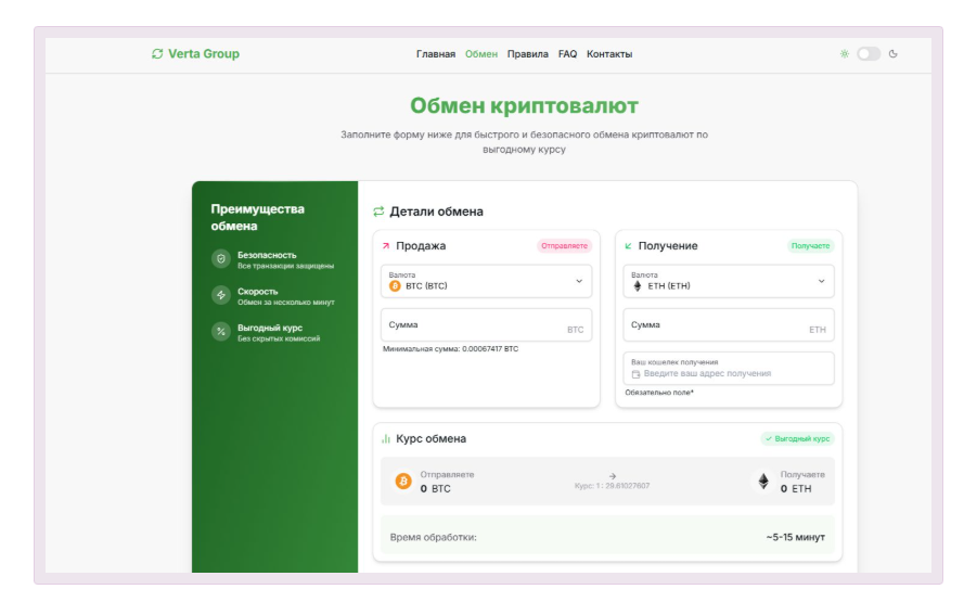 Аккаунт создавать не нужно. Для обмена заполняете форму, проходите верификацию и оплачиваете заявку. По словам сервиса, обработка занимает от 5 до 30 минут, зависит от загрузки сети. График работы на сайте не указан. Уточнять режим лучше в поддержке. Контакты: Telegram @vertagroup_net.