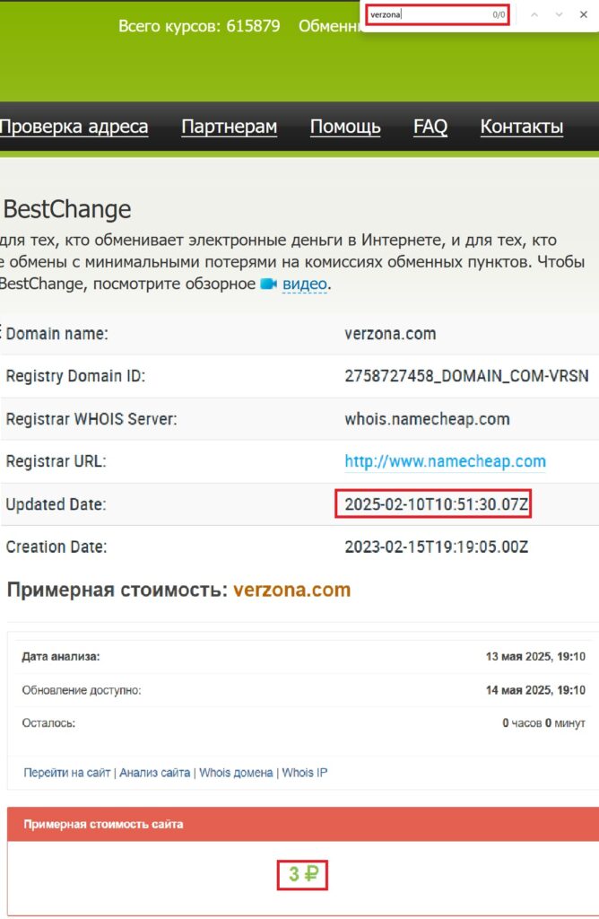 Домен Verzona com зарегистрирован через сервис дешевых доменов. Он существует еще с 2023 года, но стал адресом обменника только с последней даты обновления – на сайте указан 2025 год.Отзывы о Verzona и анализ мнений