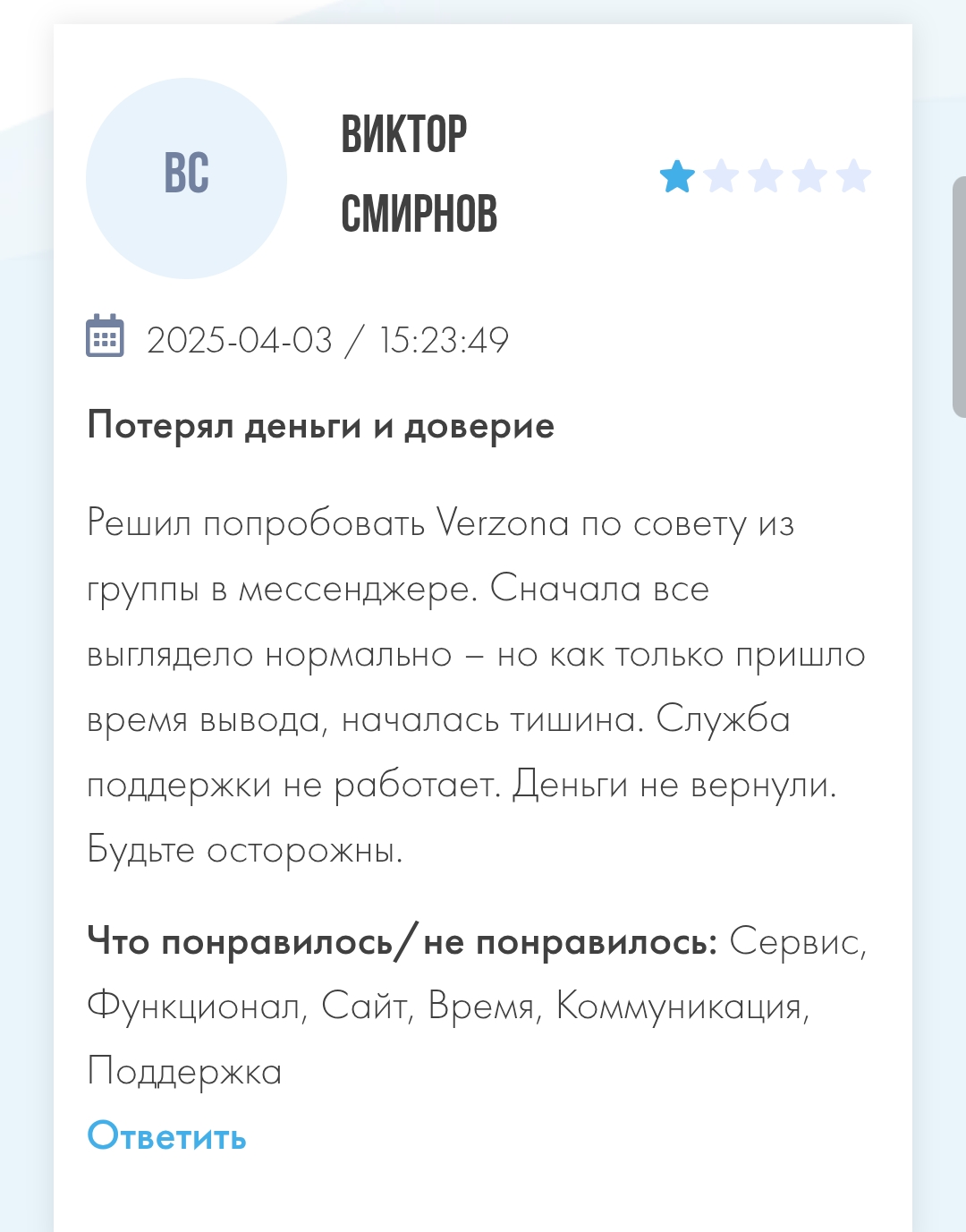 На авторитетных ресурсах вроде BestChange и Trustpilot информации о «Верзоне» нет. Это может насторожить, так как обычно клиенты делятся опытом на таких платформах, если сервис работает давно и стабильно.