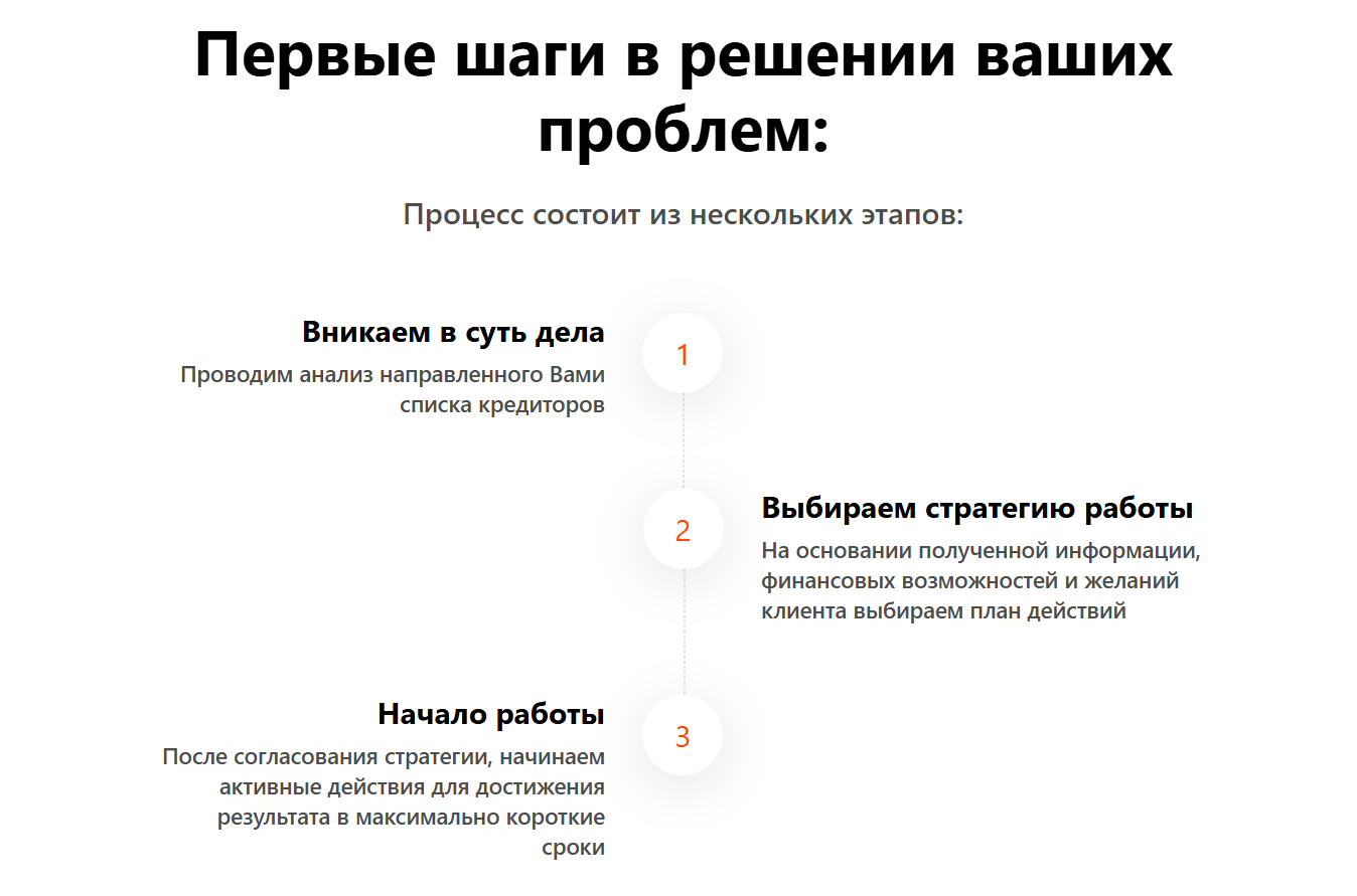 С первых дней работы компания обещает полное сопровождение для тех, кто запутался в кредитах. В их список входит защита от коллекторов, возврат переплат, оформление кредитных каникул, помощь с возвратом страховок и поддержка при банкротстве.