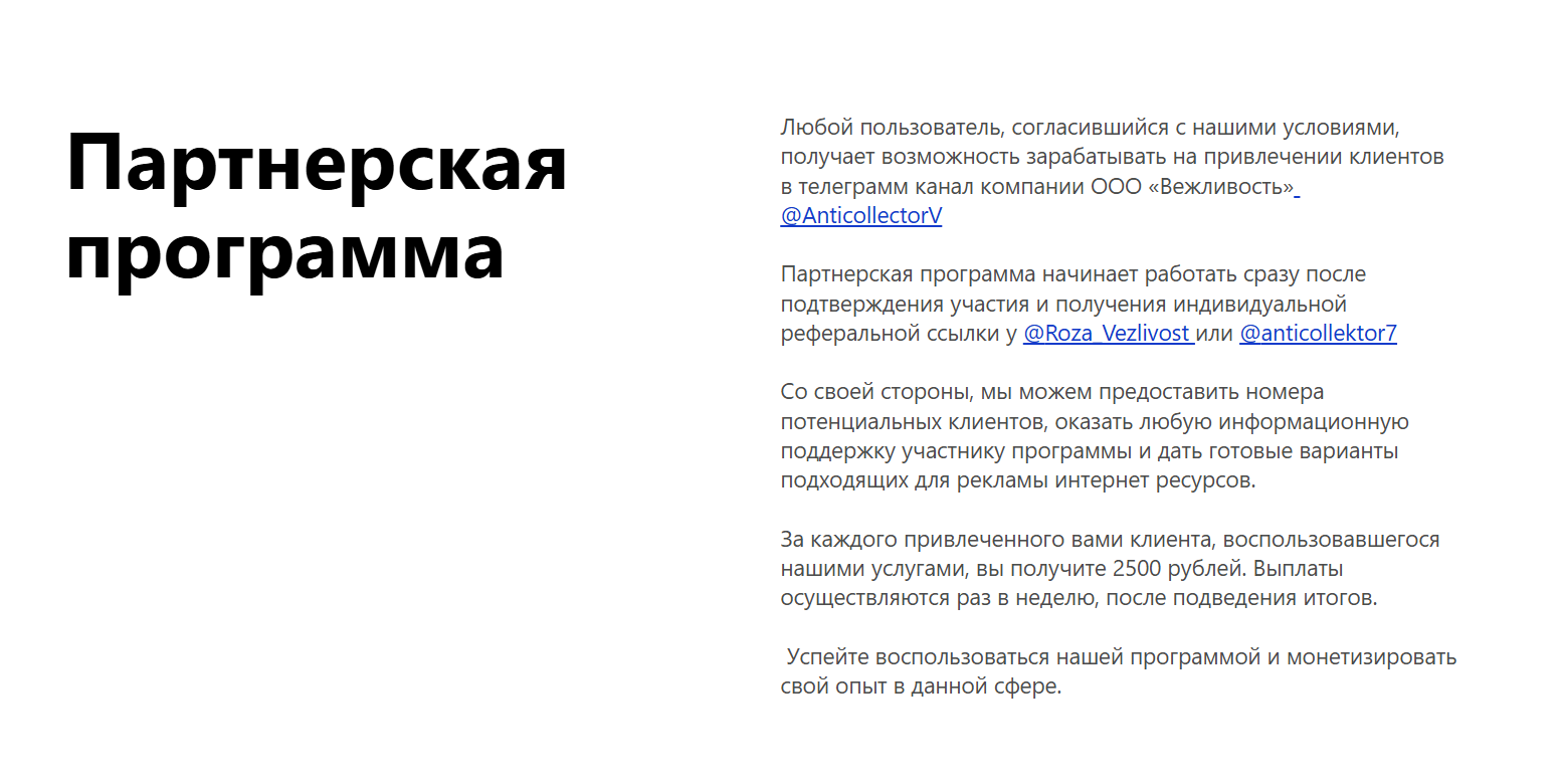 Есть еще партнерка: приводите клиента, получаете 2 500 рублей и даже готовые рекламные материалы. В телеграмме публикуют методички, примеры переписок с коллекторами и советы по кредитным каникулам. Там же работает чат поддержки, где отвечают в любое время суток.