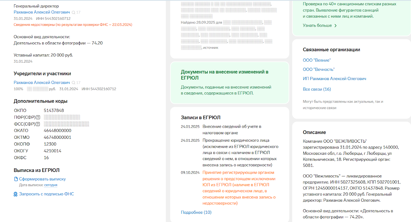Руководитель и единственный владелец — Алексей Олегович Рахманов. При этом основной вид деятельности указан вовсе не юридический и не коллекторский, а “деятельность в области фотографии”. То есть профиль бизнеса изначально никак не связан с помощью должникам.Сама компания уже не существует: 24 января 2025 г. в реестр внесли запись о том, что фирма ликвидирована а еще раньше ее исключили из ЕГРЮЛ за подачу недостоверных сведений.