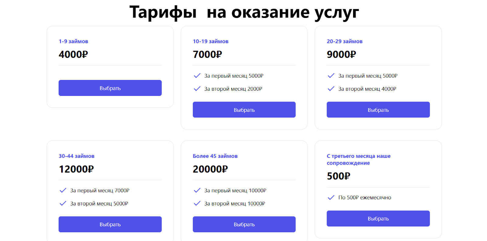 За услуги берут фиксировано: если у клиента до 9 займов, с него возьму 4 тысячи рублей, до 19 займов обойдутся уже в 7 тысяч. Ну а если долгов больше 45, это “выльется” клиенту в 20 тысяч рублей. Начиная с третьего месяца добавляется абонентка 500 рублей. Отдельно предлагают вернуть страховки по кредитам, за это берут от 30 до 50% от суммы возврата.
