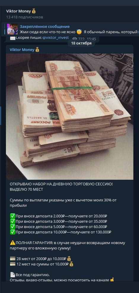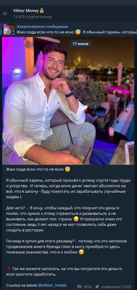 Viktor Invest — псевдофинансовая платформа за авторством некоего Виктора Сергеевича, позиционирующего себя в качестве профессионального криптовалютного трейдера. В персональном Telegram-канале молодой человек раздает всем желающим прибыль от инвестиций под феноменальные проценты, скрывая за красивыми рассказами истинные цели своего начинания.