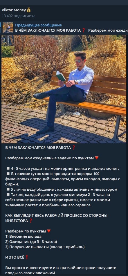 Онлайн-аферист не приводит внятного описания платформ, где реализуются торговые операции с криптой — наполнение Telegram-блога «Виктор Инвест» состоит из рисованных отзывов и коротких видеороликов, состряпанных купленными нелегальным дельцом фрилансерами. Классический для скам-проектов контент разбавляется отвлеченными рассуждениями о красивой жизни и непонятными постами, в которых администратор Виктор Сергеевич занимается неподдельным самолюбованием.