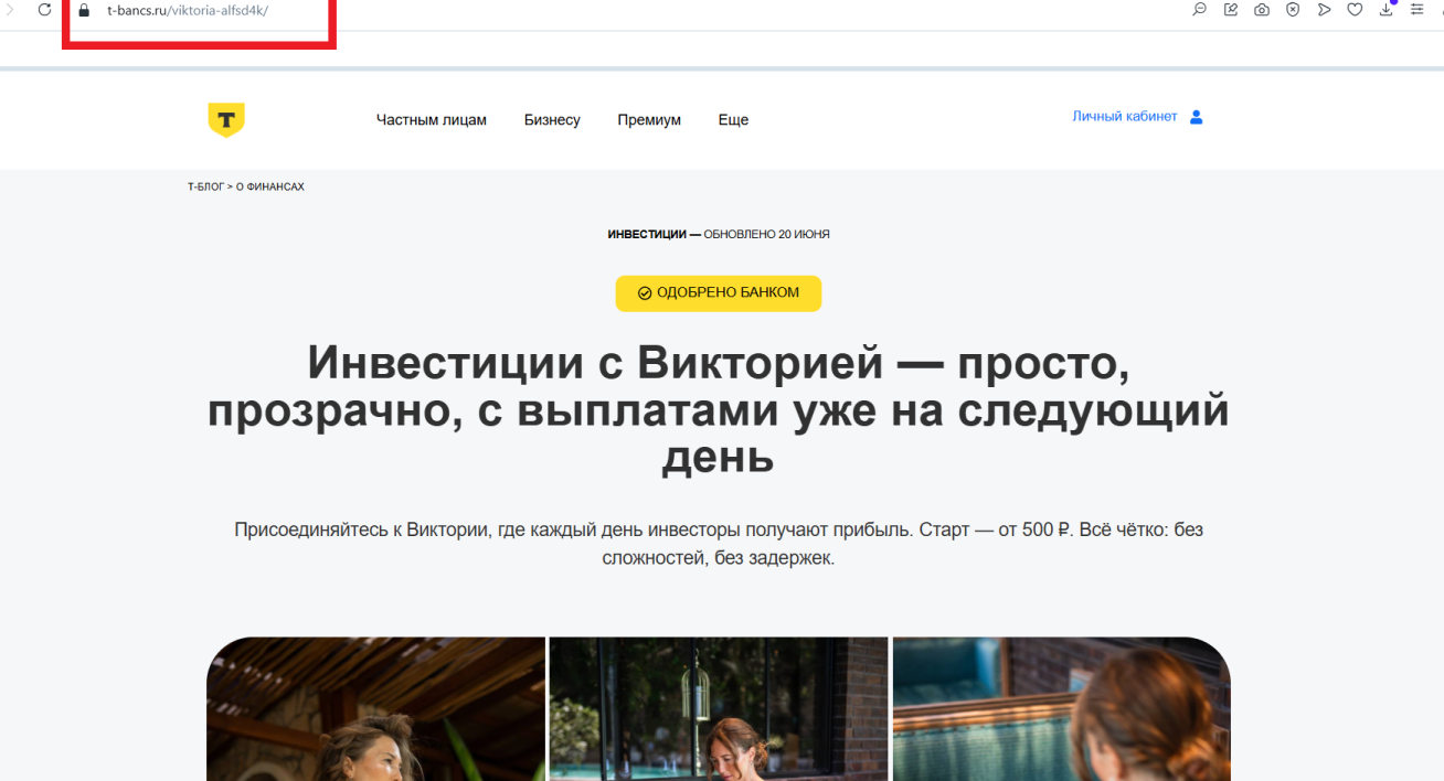 В ленте паблика Viktoria Инвестиции предоставлено только три поста, посвященных знакомству с инвестором. Здесь девушка оставляет ссылки на Т-БАНК, с которым якобы сотрудничает. При этом сайт фальшивый.