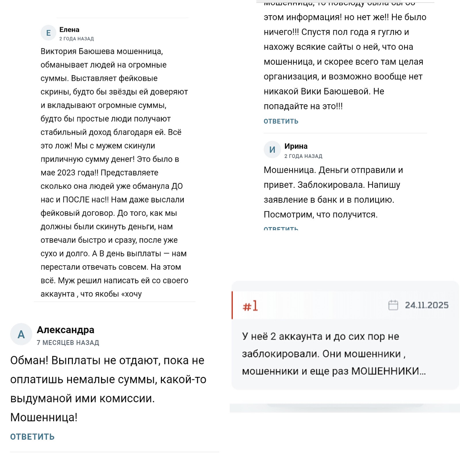 Как пишут бывшие клиенты, инвестор размещает фальшивые скрины сотрудничества с медийными личностями, чтобы вызвать доверие. Виктория высылает поддельный договор, берет средства у пользователей, просит оплачивать большие комиссии, а затем сливается.