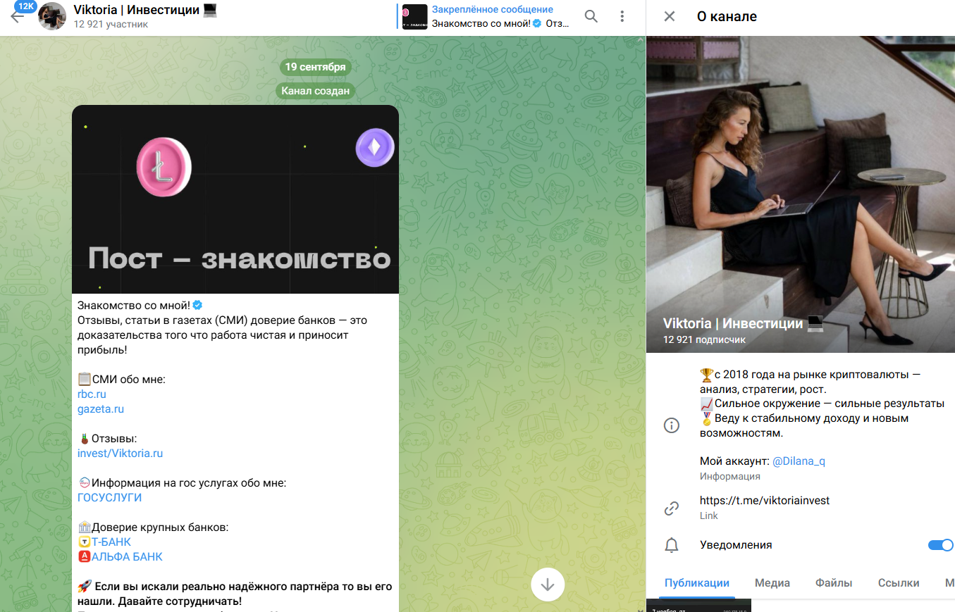 Телеграмм канал Виктория Инвестиции начал функционировать 19 сентября 2025 года. На момент написания статьи здесь 12.9 тыс. подписчиков, однако посты набрали по 3 тыс. просмотров, и лишь один 13 тыс., что может говорить о накрутке.